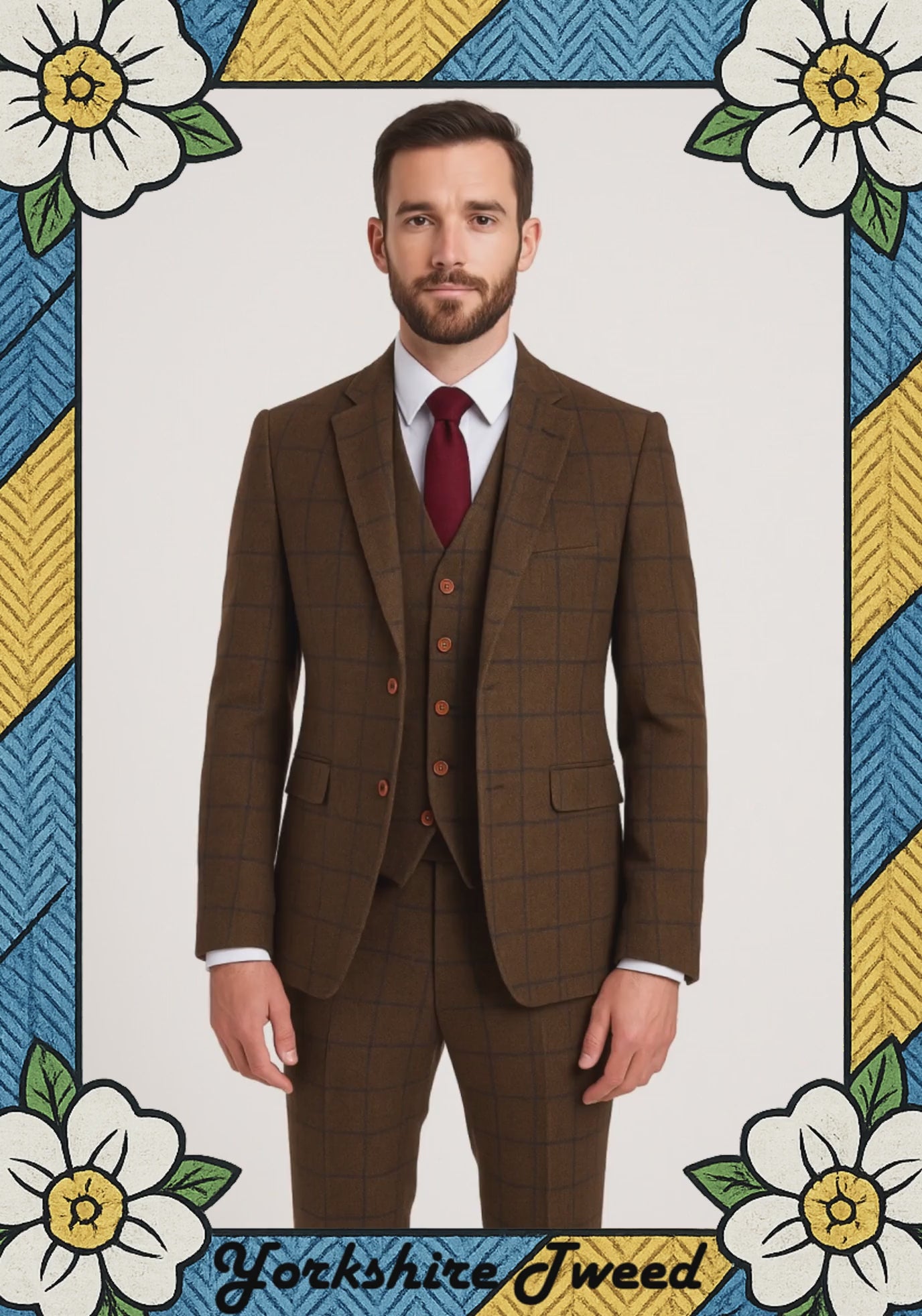 The cloth is a warm mid–brown tweed with a navy overcheck – subtle from a distance, but with enough pattern to feel properly tailored up close. It’s ideal for autumn/winter weddings, race days and smart weekends where you still want something relaxed and easy to wear.