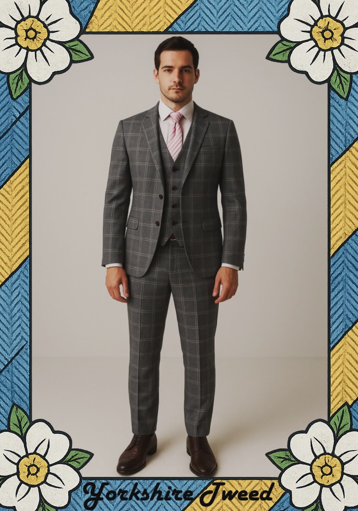 The cloth is a deep charcoal tweed with a clean windowpane check – modern, sharp and very camera-friendly for city weddings, race days and big nights out.