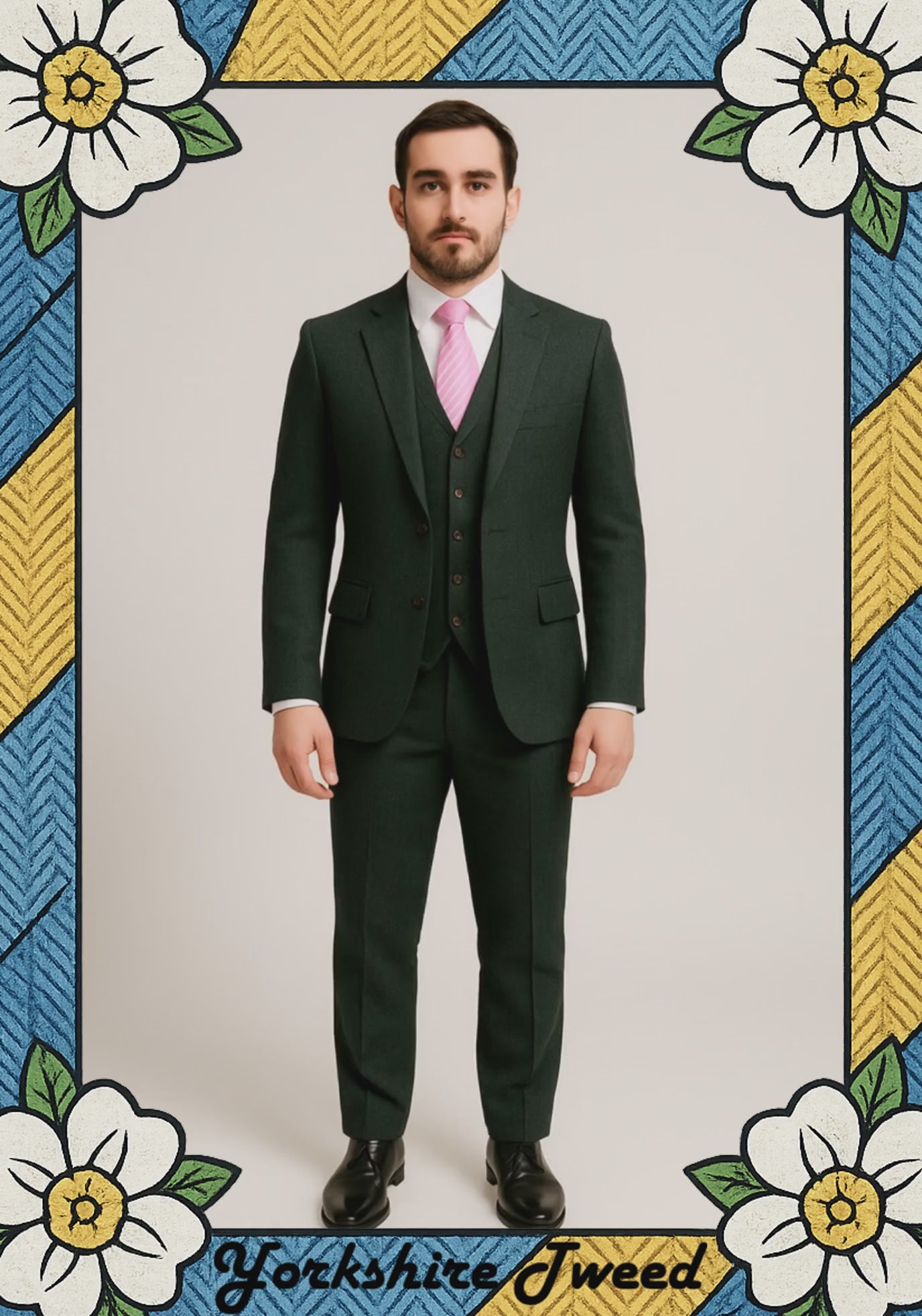 Our men’s dark green highland weave tweed three-piece suit is fully made to measure. Instead of trying to squeeze into a standard size, you choose your style options, enter your key measurements, and we cut the suit to your body – chest, waist, bum, thighs, sleeve, inside leg, the lot.