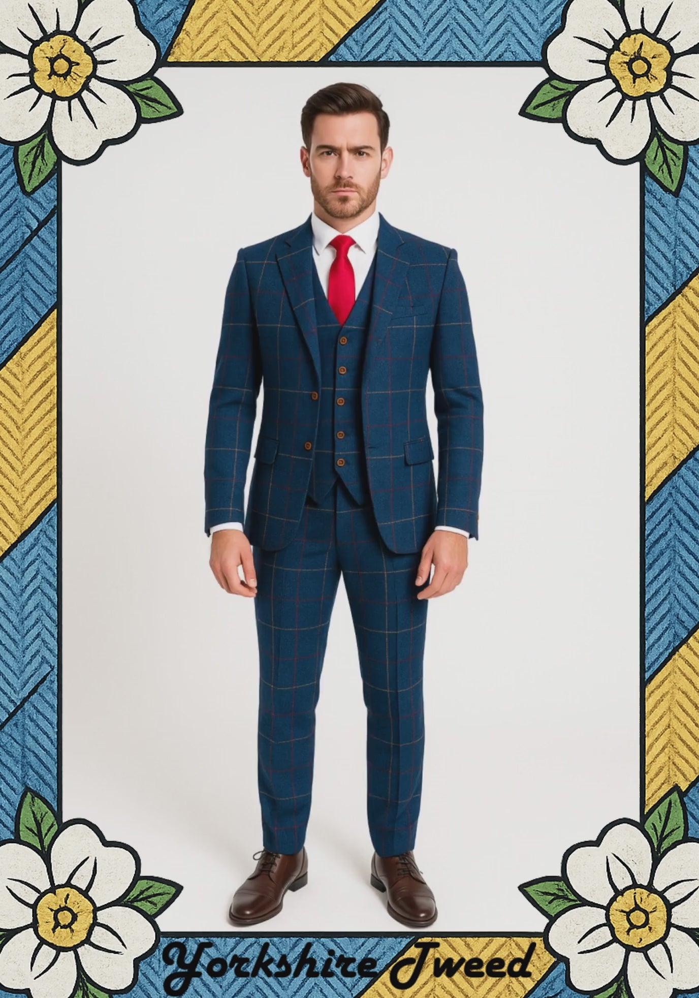 The cloth is a bold blue tweed with a large check – properly characterful, but still tailored enough to wear to weddings, race days and big nights out.