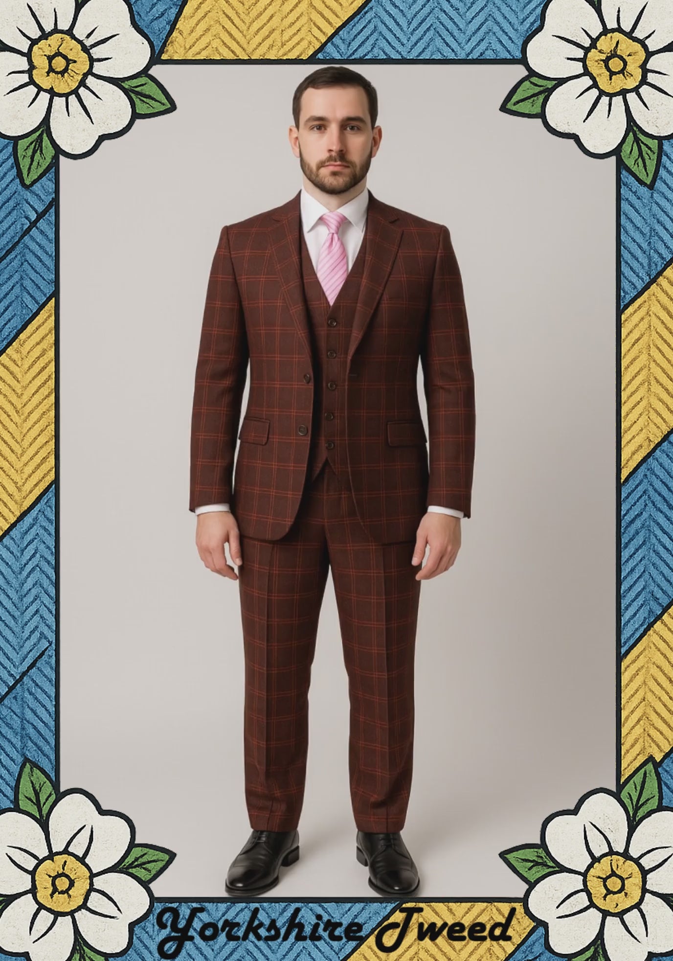• Matching mocha maroon windowpane check tweed waistcoat